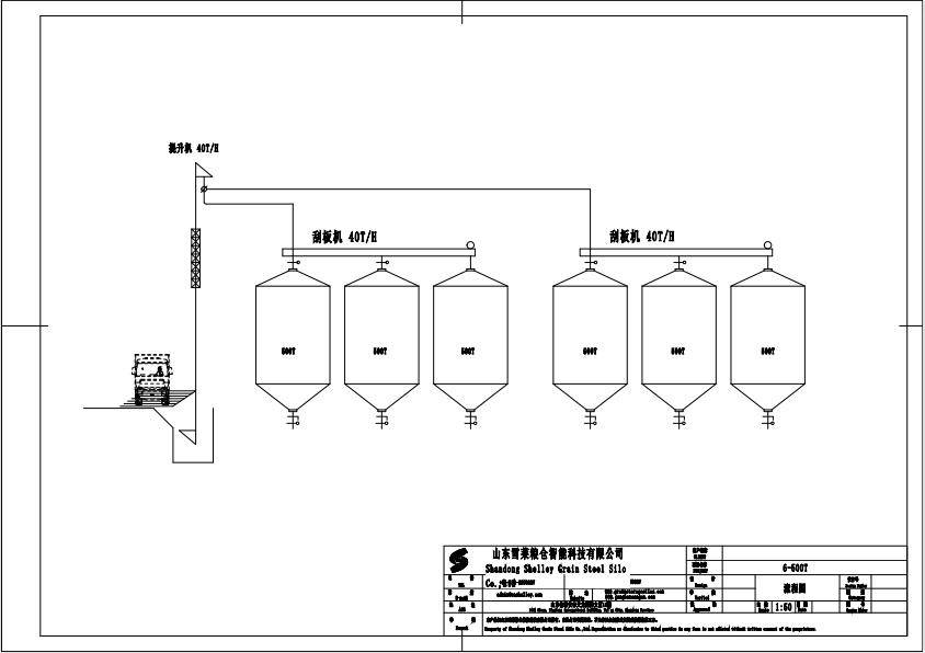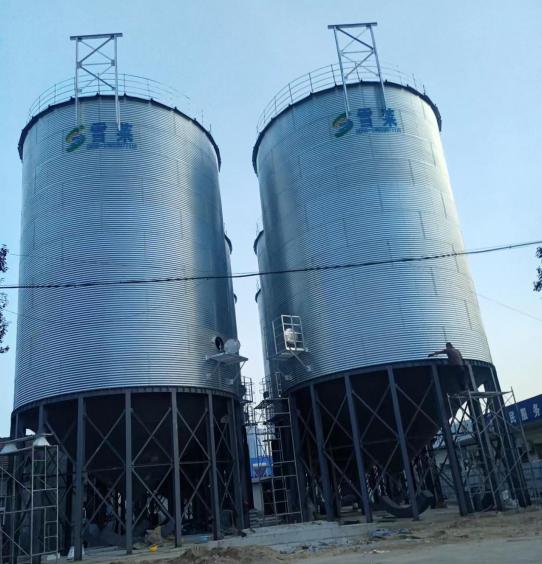 此項目為6臺500噸存儲玉米的全鋼錐底鋼板倉,三個倉一排,按照兩排分布,塔架設置在兩排中心位置,糧食經卸糧坑輸送到提升機中,再經提升機輸送到頂部配合電動三通,將糧食分別輸送到兩排鋼板倉中,倉內設有通風和測溫裝置,可以實時檢測倉內糧食溫度和濕度變化,達到安全儲糧的作用。當糧食出倉時,倉底刮板機,將糧食輸送到指定位置。