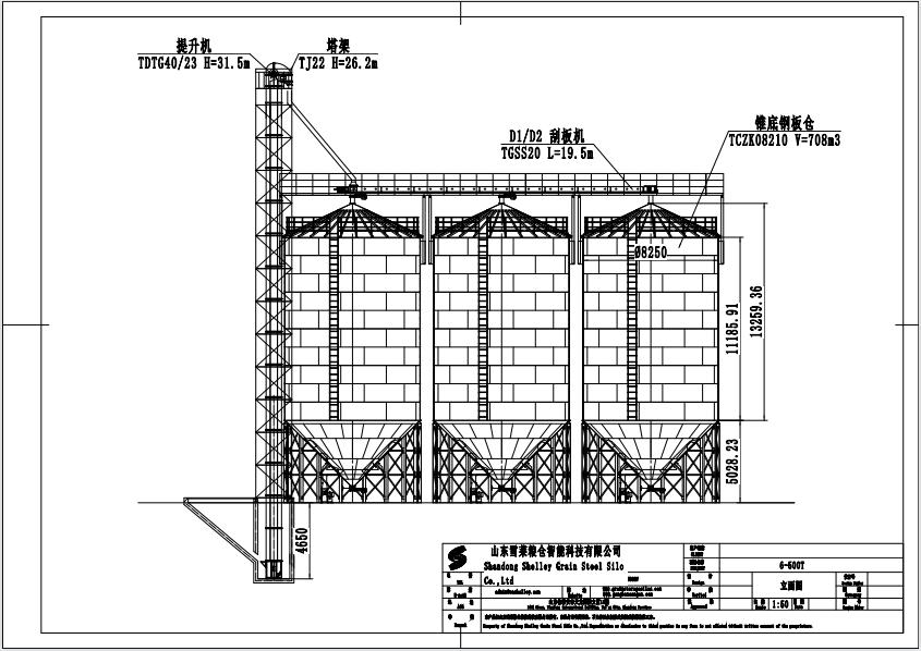 此項目為6臺500噸存儲玉米的全鋼錐底鋼板倉,三個倉一排,按照兩排分布,塔架設置在兩排中心位置,糧食經卸糧坑輸送到提升機中,再經提升機輸送到頂部配合電動三通